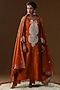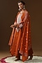 Featuring an orange kurta in raw silk base with thread and zari embroidery. It is paired with georgette pants and a patra dupatta. Accentuate the designer set with swarovski jewellery, embellished heels and a potli bag for a look, Perfect wear for a festive , sangeet or haldi ceremony.