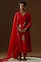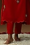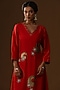 Featuring a red kurta in summer silk base with hand painted floral and cutdana embroidery. It is paired with upada pants and a kota dupatta having hand-painted motifs detail. Accentuate the designer set with swarovski jewellery, embellished heels and a potli bag for a look, Perfect wear for a festive occasion, sangeet or pooja ceremony.