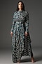 Featuring a teal blue cowl draped dress in silk base with print. It is paired with with a matching butterfly belt.