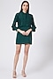 Featuring a bottle green pleated mini dress in crepe base with pleated frills on the sleeves.
