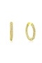 Featuring a pair of gold finish hoop earrings studded with cubic zirconia, set in recycled bronze. Perfect choice for weddings, parties, and other Indian festivities.