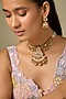 Featuring a gold finish temple necklace studded with motifs, emerald beads and zircons, set in mixed metal. It is paired with a matching pair of earrings. Perfect for grand occasions like weddings and traditional festivities.