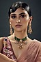 Featuring a gold finish temple choker necklace studded with uncut zircons, temple motifs, pearls and synthetic green beads, set in mixed metal. It is paired with a matching pair of earrings. Perfect wear for festive occasions or wedding ceremonies.