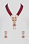 Featuring a micro gold finish long mala necklace studded with kundan polki, maroon beads and ruby synthetic stones, set in mixed metal. It is paired with a matching pair of earrings. Perfect for festive or wedding occasions.