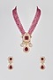 Featuring a micro gold finish long mala necklace studded with ruby synthetic stones, set in mixed metal. It is paired with a matching pair of earrings. Perfect for festive or wedding ceremony.