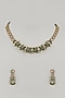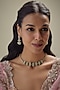 Featuring a victorian finish necklace studded with kundan polki, american diamonds and emerald doublet stones, set in mixed metal. It is paired with a matching pair of earrings. Ideal for festive occasions or wedding celebrations.
