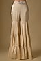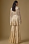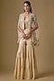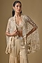 Featuring a beige short cape in satin and tulle base with hand and machine embroidery. It is paired with a blouse and sharara pants. Style it with soft curls, minimal jewellery, and delicate heels for a dreamy feminine look. Perfect for mehendi events, sangeet nights, festive celebrations, and daytime weddings.