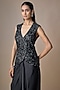 Featuring a black short jacket in satin tulle base with hand and machine embroidery. It is paired with a draped skirt. Accentuate it with statement earrings, a sleek low bun, and metallic heels for a dramatic ensemble, ideal for cocktail evenings, reception nights or glamorous celebrations.