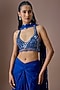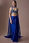 Featuring an electric blue draped blouse in satin tulle base with hand and machine embroidery, adorned with latkans. It is paired with a draped skirt and a mirror-work dupatta. Style it with jewellery and classic heels for a regal, polished look. Perfect for weddings, festive celebrations and sangeet ceremonies