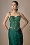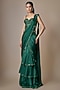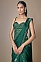 Featuring an emerald green draped saree in satin tulle base with hand and machine embroidery. It is paired with a corset blouse. Accentuate it with statement chandelier earrings and metallic heels for a striking ensemble, ideal for cocktail evenings, reception nights, or elegant celebrations.
