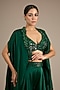 Featuring an emerald green cape in satin tulle base with floral border detail. It is paired with a mirror work blouse and sharara pants having hand and machine embroidered waistband. Accentuate it with kundan polki jewellery and block heels for a mehendi, wedding or festive ceremony.