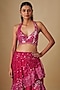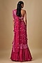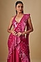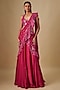 Featuring a fuchsia draped saree in satin, chiffon and tulle base with hand embroidery. It is paired with an embroidered blouse. Accentuate statement earrings and heels for a wedding or sangeet ceremony.