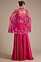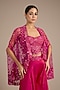 Featuring a fuchsia short cape in satin tulle base with hand and machine embroidery. It is paired with a corset blouse and sharara pants. Accentuate it with kundan polki jewellery and block heels for a sangeet, wedding or festive ceremony.