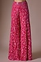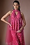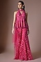 Featuring a fuchsia peplum top in tulle base with embroidery. It is paired with embroidered sharara and a dupatta. Accentuate it with dangler earrings and stilettos for a festive occasion, wedding or sangeet ceremony.