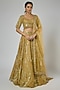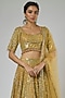 Featuring a gold lehenga in tulle base with hand embroidery. It is paired with an embroidered blouse and a dupatta. Accentuate the designer lehenga with kundan polki or emerald jewellery, embellished heels and a potli bag for a bridal look, Perfect wear for your wedding, sangeet or engagement ceremony.