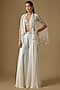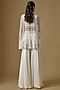 Featuring an ivory short cape in satin and tulle base with hand and machine embroidery. It is paired with a blouse and sharara pants. Style it with soft curls, minimal jewellery, and delicate heels for a dreamy feminine look. Perfect for mehendi events, sangeet nights, festive celebrations, and daytime weddings.