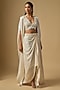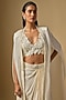 Featuring an ivory cape in satin tulle base with hand and machine embroidery. It is paired with a blouse and a skirt. Accentuate it with dangler earrings and heels for a reception, cocktail, sangeet or engagement ceremony.