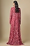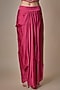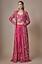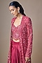 Featuring a magenta long jacket in satin tulle base with hand and machine embroidery. It is paired with a corset blouse and a draped skirt. Accentuate it with statement earrings, a sleek low bun, and metallic heels for a dramatic ensemble, ideal for sangeet nights or glamorous celebrations.