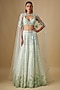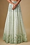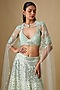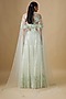 Featuring a mint lehenga in satin organza, tulle and chinon butter crepe base with hand and machine embroidery. It is paired with an embroidered blouse and a cape dupatta. Accentuate it with statement earrings and heels for a wedding or engagement ceremony.
