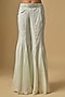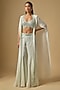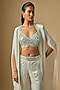 Featuring a mint cape in satin tulle base with mirror hand and machine embroidery. It is paired with a blouse and flared sharara pants. Accentuate it with dangler earrings and heels for a reception, cocktail, sangeet or engagement ceremony.