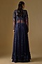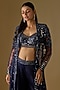 Featuring a navy blue long jacket in satin and tulle base with hand and machine embroidery. It is paired with a blouse having mirror work and sharara pants. Style with layered jewelry and neutral heels to balance the look, Ideal for evening parties, sangeet or cocktail ceremonies.
