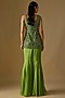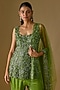 Featuring an olive green short kurta in satin and tulle base with hand and machine embroidery. It is paired with sharara pants and a satin organza dupatta. Style with layered jewelry and neutral heels to balance the look, Ideal for a festive, mehendi, sangeet or cocktail ceremonies.