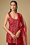 Featuring a red short kurta in satin tulle base with hand embroidery. It is paired with sharara, including a satin organza and tulle dupatta. Accentuate it with statement jhumkas, a richly embellished potli bag and classic embroidered heels for a stylish ensemble, ideal for wedding festivities or vibrant festive celebrations.