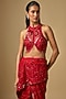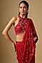Featuring a red draped saree in tulle and chinon satin base with hand and machine embroidery. It is paired with a blouse having latkan detail. Accentuate it with dangler earrings and heels for a festive occasion, wedding, sangeet or engagement ceremony.