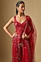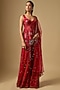 Featuring a red kurta in tulle and chinon satin base with hand and machine embroidery. It is paired with mirror embroidered sharara pants and a dupatta. Accentuate it with dangler earrings and heels for a festive occasion, wedding, sangeet or engagement ceremony.