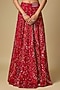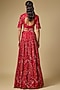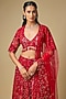 Featuring a red lehenga in tulle base with gold hand embroidery. It is paired with a blouse and a dupatta. Accentuate it with statement emerald jewellery, a richly embellished potli bag, and classic heels for a stylish ensemble, ideal for wedding ceremonies or bridal festivities.