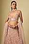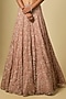 Featuring a rose gold lehenga in satin, chinon and tulle base with hand embroidery. It is paired with a blouse and a dupatta. Accentuate it with statement earrings and heels for a bridesmaid look, weddings or sangeet ceremonies.