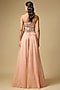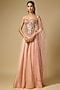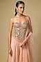 Featuring rose gold sharara pants in tissue and tulle base. It is paired with a corset blouse and a hand embroidered dupatta. Accentuate it with delicate diamond jewellery, a shimmering clutch and elegant heels for a stylish ensemble, ideal for engagement ceremonies, reception nights or glamorous evening celebrations.