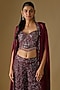 Featuring a wine corset blouse in satin and tulle base with hand and machine embroidery. It is paired with sharara pants and a dupatta. Style with layered jewelry and neutral heels to balance the look, Ideal for festive, sangeet or cocktail ceremonies.