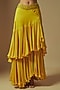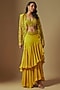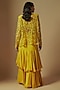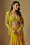 Featuring a yellow jacket in satin organza and tulle base with hand embroidery. It is paired with a hand embroidered blouse and a draped skirt. Style it with statement earrings and heels for any festive occasion or sangeet ceremony.