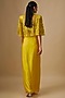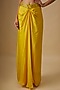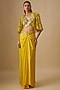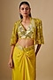 Featuring a yellow cape in satin organza, tulle and butter crepe base with mirror hand and machine embroidery. It is paired with a blouse and a draped skirt. Accentuate it with minimal jewellery and heels for a festive, haldi or sangeet ceremony.