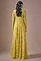 Featuring a yellow jacket in satin and tulle base with beads embroidery. It is paired with an embroidered blouse and sharara pants. Accentuate it with zircon jewellery, embellished heels, a sleek bun and a potli bag for a sangeet look, haldi or cocktail soirees.