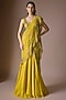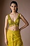 Featuring a yellow draped saree in satin tulle base with handwork. It is paired with a blouse. Accentuate it with zircon earrings and stilettos for a festive occasion, reception, haldi, wedding or sangeet ceremony.