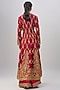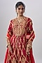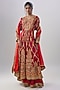 Featuring a maroon anarkali in modal satin base with gota embroidery. It is paired with pants and an orange rust organza dupatta. Accentuate it with statement earrings and elegant heels for a chic look, perfect for festive gatherings, sangeet ceremonies, family celebrations or cultural events.
