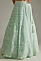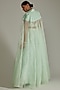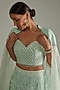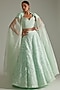 Featuring a mint green cape in blended georgette base with scuba detailing. It is paired with a matching blouse and a ghagra.