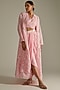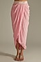 Featuring a pink kali coat in blended georgette base with scuba detailing. It is paired with a matching blouse and a sarong skirt.