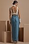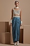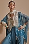 Featuring a dull teal jacket in sheer silk base with lace work and tribal tassel detailing. It is paired with a net and silk bead embroidered blouse and a natural crepe pleated skirt. Accentuate it with boho jewellery and heels for festive occasions.