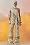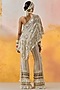 Aseem Kapoor features an ivory one shoulder top in sheer silk base with lace embroidery. It is paired with embroidered bootleg trousers. Accentuate with statement earrings and heels for festive occasions.
