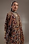 Featuring a jamuni colored draped dress in natural crepe base with embroidery and print. It is paired with a sheer silk jacket having resham thread embroidery and print. Accentuate it with zircon earrings, strappy heels and a clutch for evening wear, boho themed or cocktail parties.