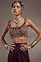 Featuring a jamuni colored jacket in sheer silk base with resham thread embroidery. It is paired with a crushed silk skirt and a cotton silk blouse. Accentuate it with zircon earrings, strappy heels and a clutch for family gatherings or festive ceremonies.