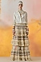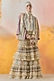 Featuring a mogra white textured straight shirt in crushed silk base. It is paired with a sheer silk, net and cotton lace tiered ruffled lehenga, including a mushroom twill double breasted jacket having embroidery and print. Accentuate it with pearl jewellery, embellished heels and a clutch for festive celebrations or cocktail ceremony.