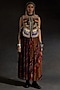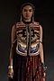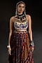 Featuring a multi-colored gilet in cotton silk and mushroom twill base with resham, beads and thread embroidery. It is paired with a crepe blouse and a sheer silk printed pleated skirt. Accentuate it with statement earrings and heels for a festive or cocktail look.