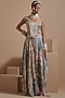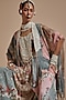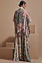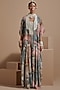 Featuring a multi-colored jacket in sheer silk base with print and embroidery. It is paired with a mushroom twill bead embroidered blouse and a natural crepe flared skirt. Style it with boho jewellery and heels for festive occasions.