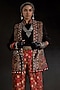 Featuring a multi-colored sleeveless jacket in velvet base with print and embroidery. It is paired with a crushed silk shirt having an embroidered collar and mushroom twill straight trousers. The ensemble strikes the perfect balance between tradition and contemporary finesse, making it an impeccable choice for evening soirees and festive celebrations.
