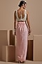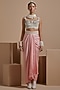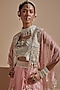 Featuring a shell pink jacket in sheer silk base with lace work and tribal tassel detailing. It is paired with a net and silk bead embroidered blouse and a natural crepe pleated skirt. Accentuate it with boho jewellery and heels for festive occasions.