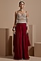 Featuring a multi-colored blouse in dola silk and mushroom twill base with resham, thread, bead, and mother of pearl embroidery. It is paired with a shocking pink natural crepe flared skirt. Style it with boho jewellery and heels for festive occasions.